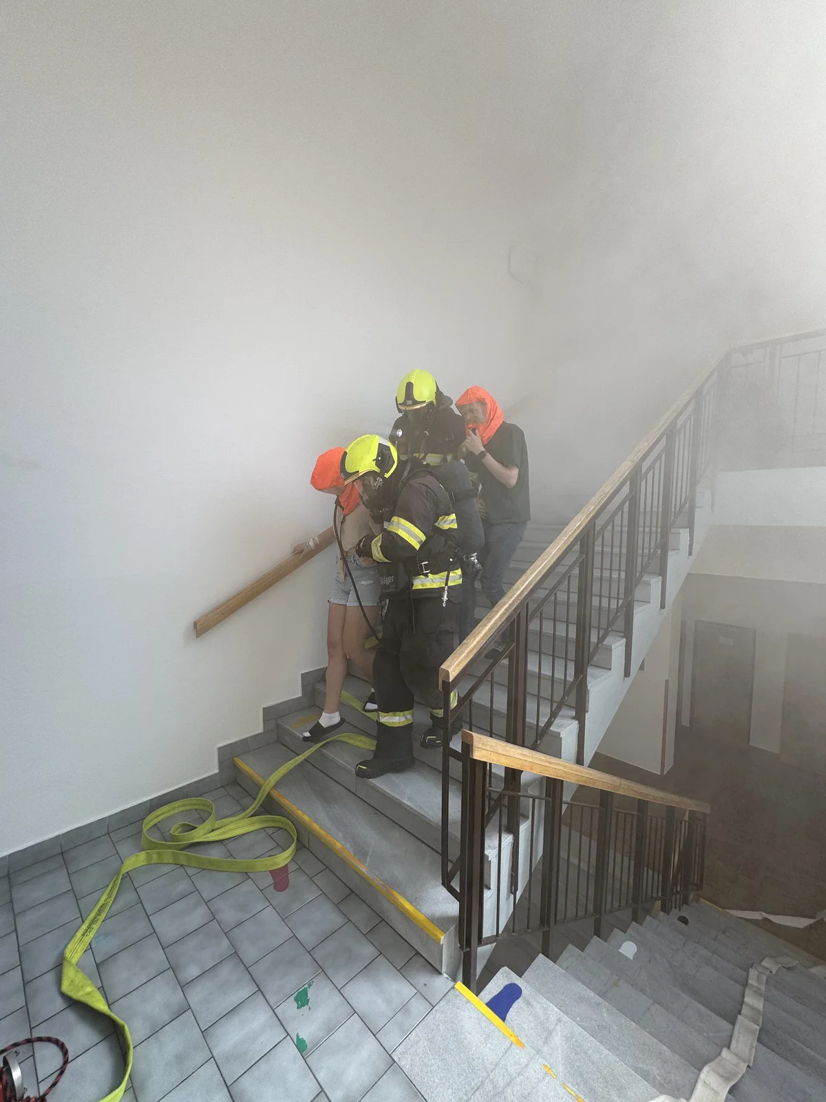 Součástí cvičení byla i záchrana pedagoga, který se snažil nejdříve simulovaný oheň uhasit a následně se nadýchal kouře. Viditelnost byla v hustě zakouřené místnosti prakticky nulová. Omámenému pedagogu byla nasazena kyslíková terapie a byl transportován pomocí výsuvného koše AP do bezpečí. Zachráněni byli i dva žáci ze zakouřeného prostoru, kteří se ukryli v panickém strachu na záchodech a jejich nepřítomnost byla zjištěna mezi evakuovanými žáky při kontrole na určeném shromaždišti před ZUŠ. Vše proběhlo hladce a podle plánu. Žáci i pedagogický a provozní personál zvládly evakuaci velmi dobře – rychle, organizovaně a bez jakýchkoli komplikací. Celá škola byla vyklizena do tří minut, což je výsledek, který nás velmi potěšil a potvrzuje vysokou úroveň připravenosti všech zúčastněných. Všichni dodrželi stanovené postupy a prokázali tak svou připravenost na krizové situace.