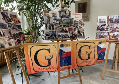 Studenti si v rámci Erasmu Day ve vestibulu mohli prohlédnout na nástěnkách fotografie z již proběhlých akcí a také se seznámit s plány do budoucna. K vidění byla i naše nová vlajka Erasmus+, kterou budou studenti vozit s sebou do zahraničí a prezentovat naši školu. Po celou dobu probíhala i projekce fotografií a videí z již realizovaných mobilit studentů. Zájemci o individuální mobilitu zde našli také potřebné informace, co udělat, pokud se chtějí zúčastnit mobilit. Součástí prezentací byli i přítomní studenti z loňských individuálních mobilit, kteří byli ochotni zájemcům sdělit svoje bezprostřední dojmy, zajímavosti, zkušenosti a zážitky ze studií v zahraničí.