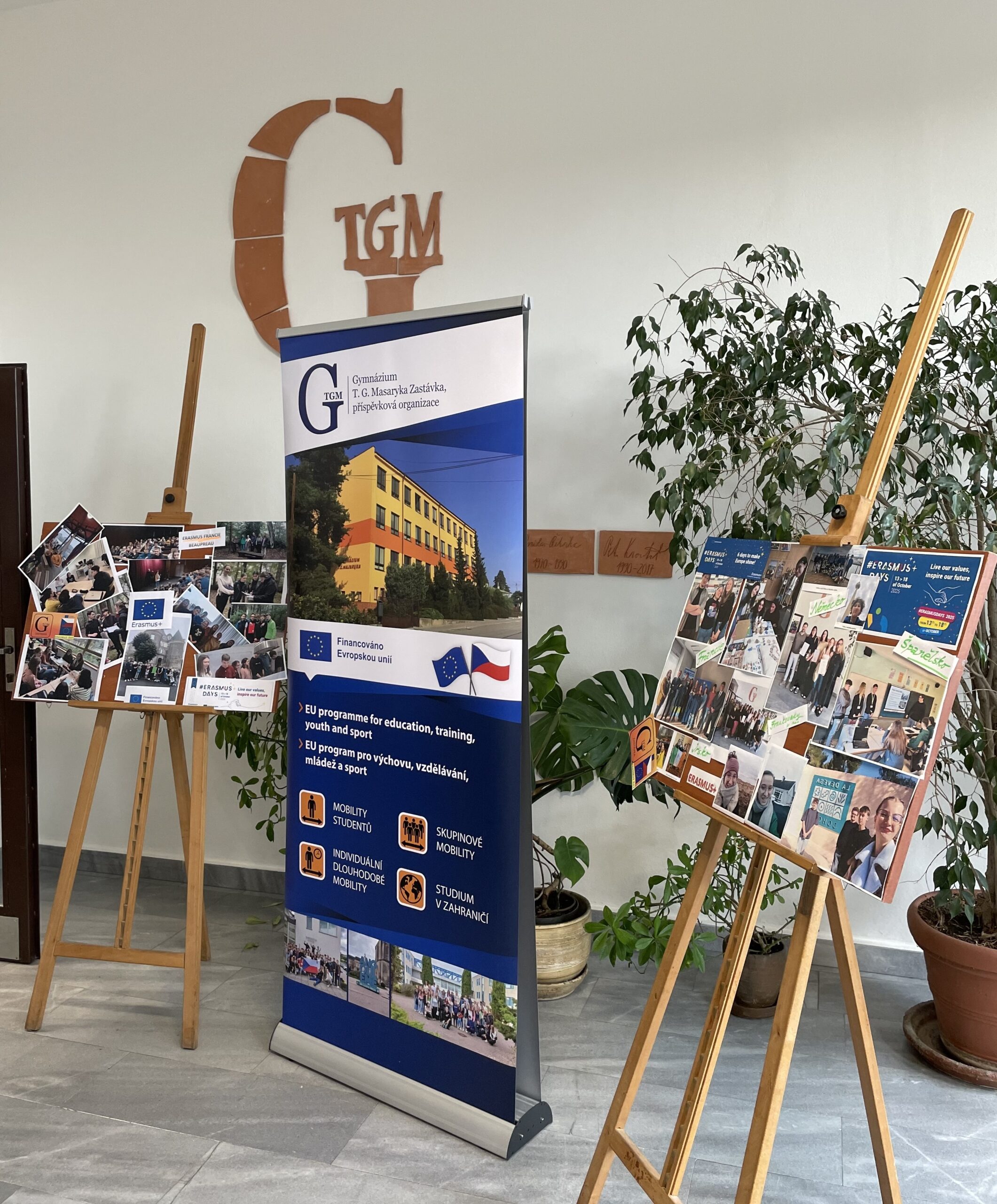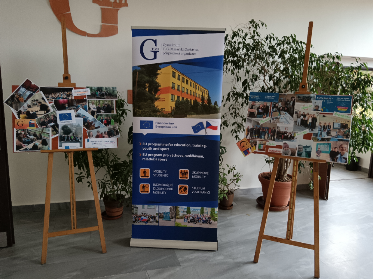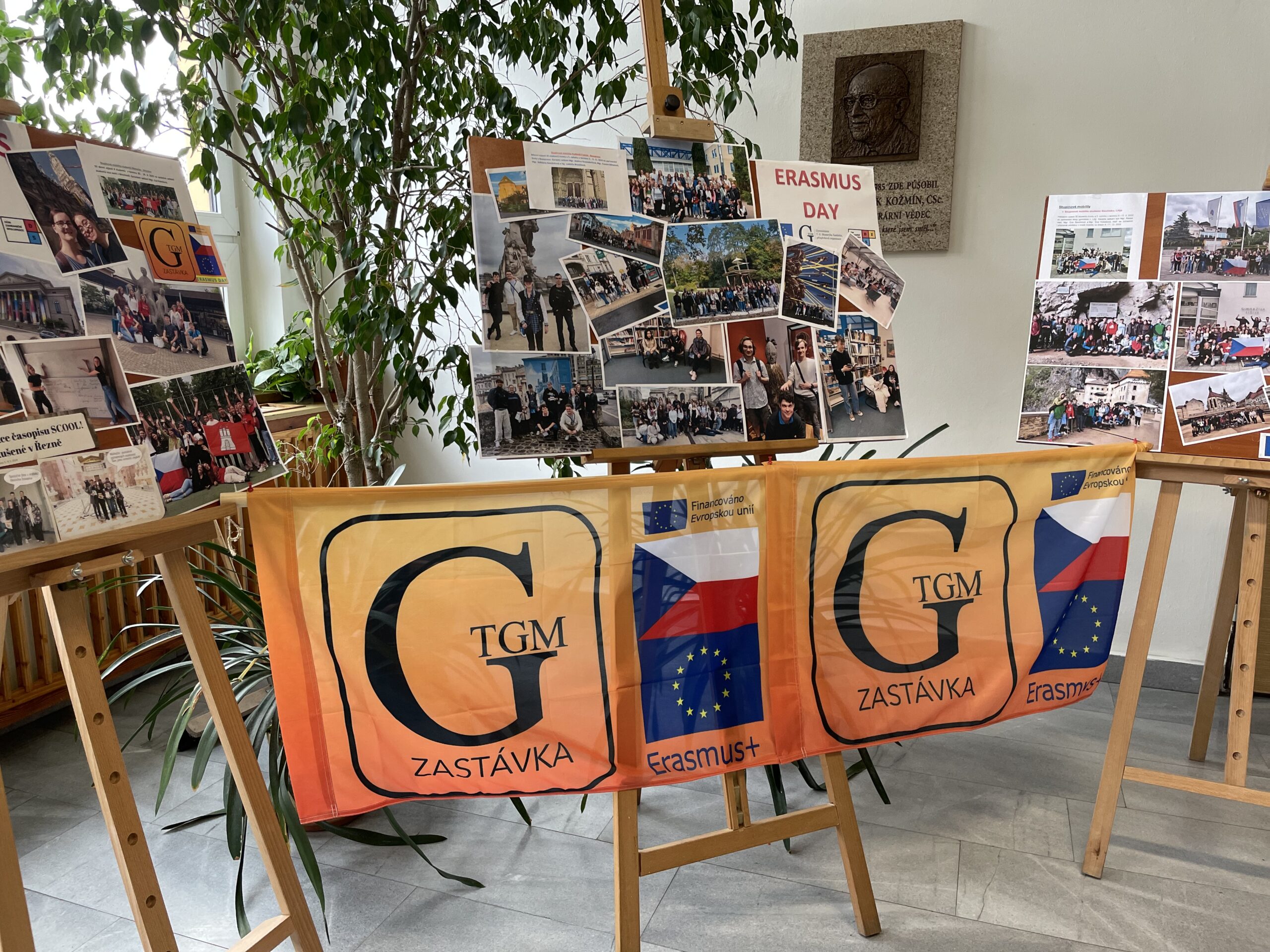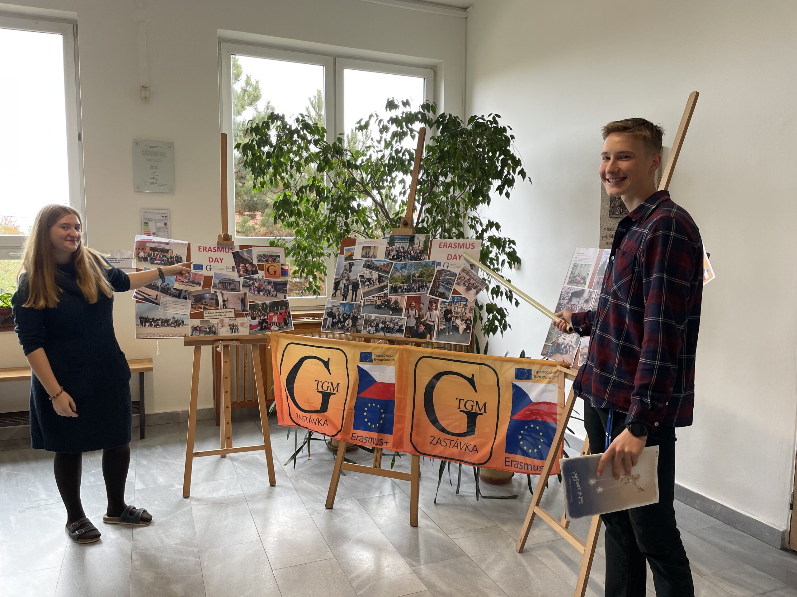 Studenti si v rámci Erasmu Day ve vestibulu mohli prohlédnout na nástěnkách fotografie z již proběhlých akcí a také se seznámit s plány do budoucna. K vidění byla i naše nová vlajka Erasmus+, kterou budou studenti vozit s sebou do zahraničí a prezentovat naši školu. Po celou dobu probíhala i projekce fotografií a videí z již realizovaných mobilit studentů. Zájemci o individuální mobilitu zde našli také potřebné informace, co udělat, pokud se chtějí zúčastnit mobilit. Součástí prezentací byli i přítomní studenti z loňských individuálních mobilit, kteří byli ochotni zájemcům sdělit svoje bezprostřední dojmy, zajímavosti, zkušenosti a zážitky ze studií v zahraničí.