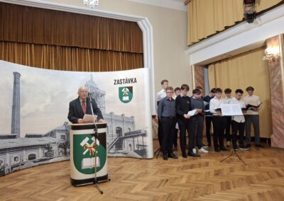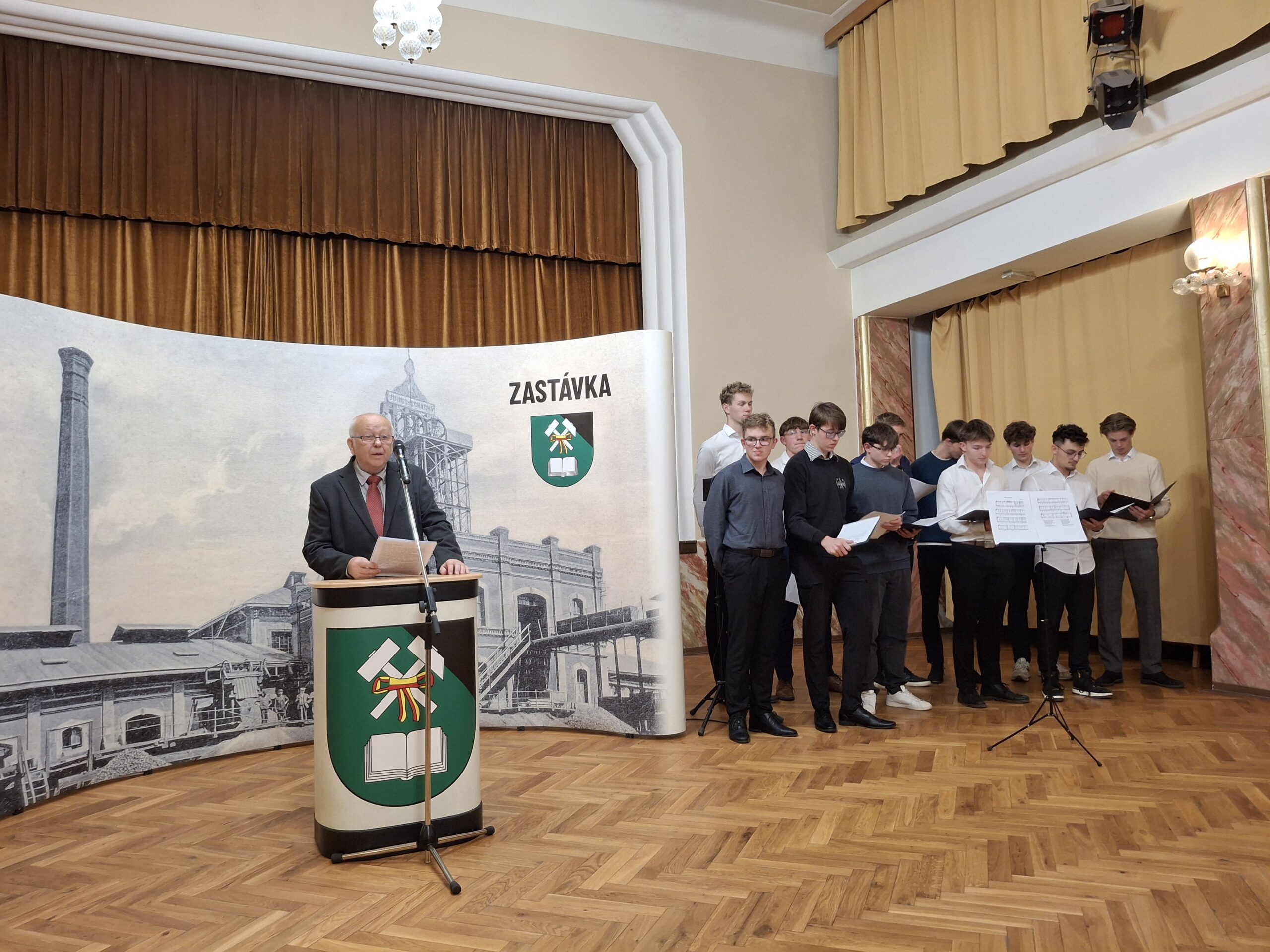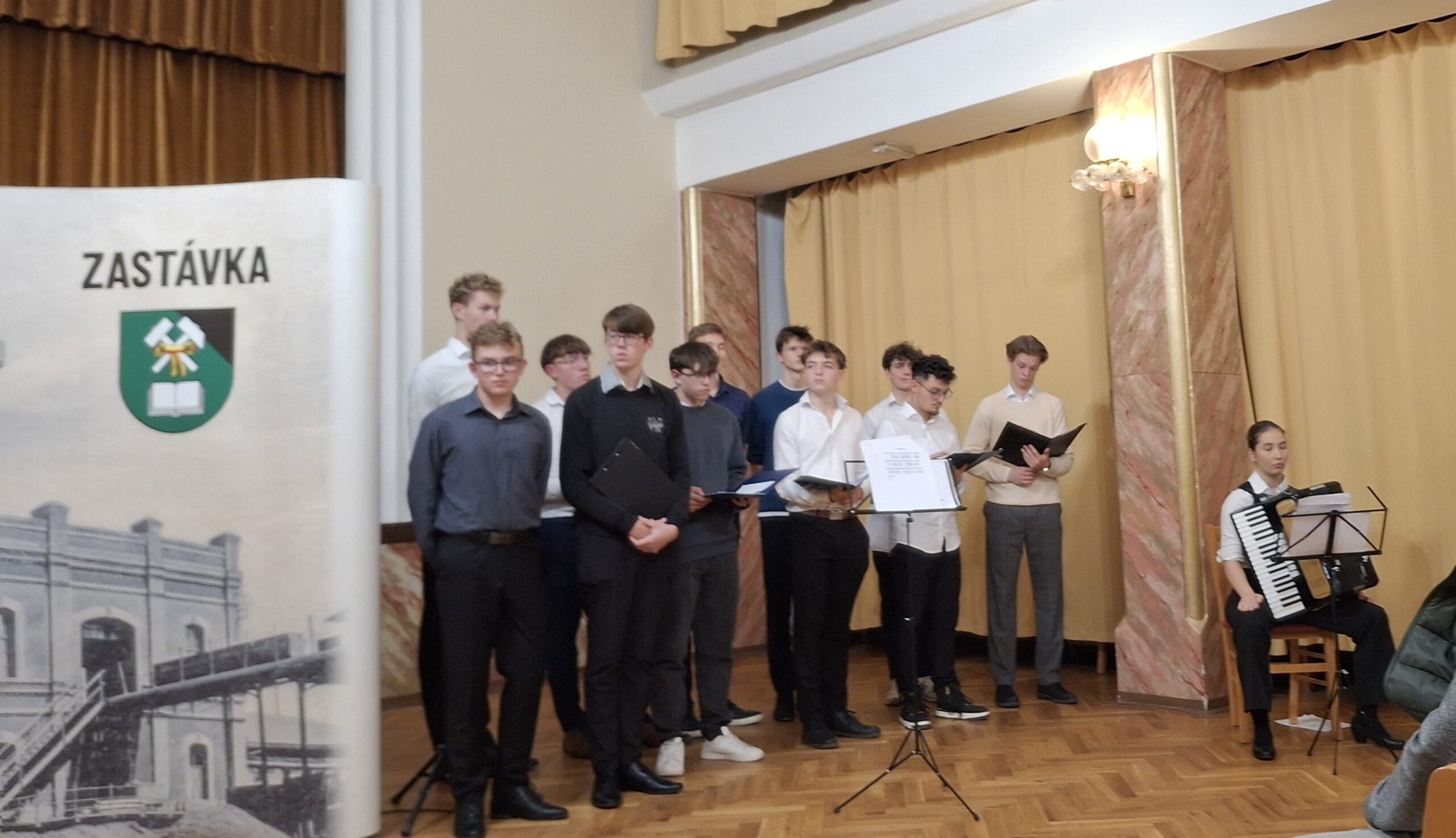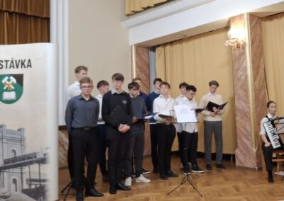 Slavnostní program velmi obohatil pěvecký sbor našeho gymnázia pod vedením Mgr. Evy Konečné a za doprovodu na akordeon studentky Jany Pragerové, a tím přispěl k důstojné a dojemné atmosféře celé akce. Celou slavnost potom zakončil krásným přednesem vojenské večerky na trubku student Václav Rada.