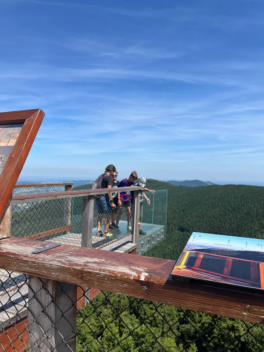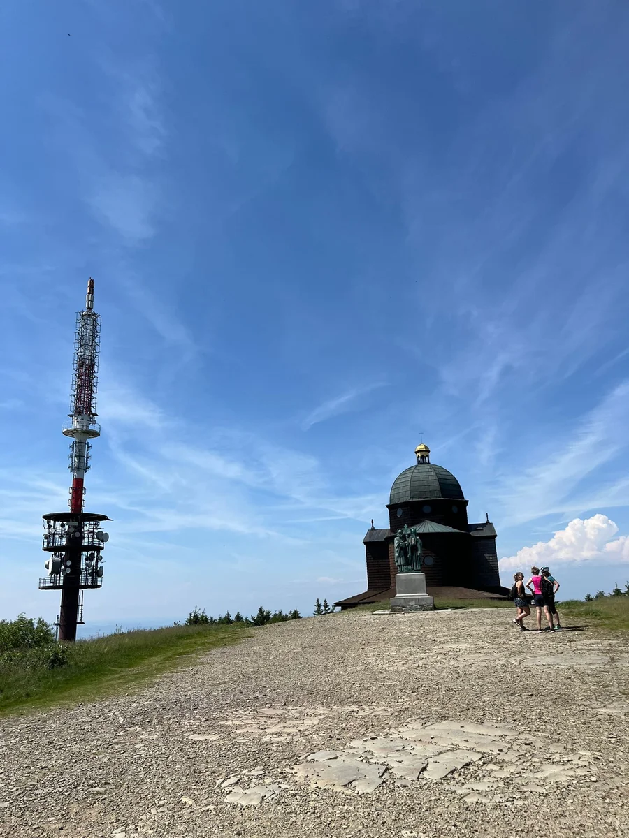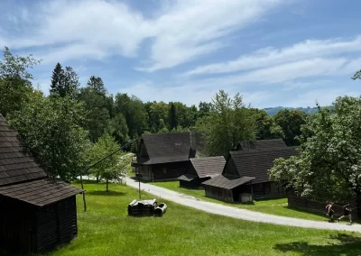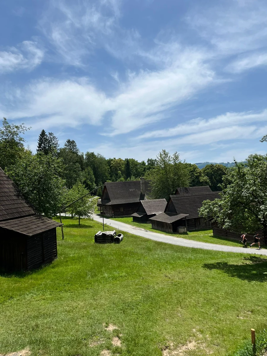 Ubytovaní jsme byli v hostelu v Rožnově pod Radhoštěm a naplno jsme si užívali všech výhod, které nám ubytování nabízelo, výborné polopenze formou bufetu, vnitřního i venkovního bazénu, sauny, vyblokovaného hostelu pouze pro nás. 🙂 Zvládli jsme skoro patnáctikilometrovou túru z Pusteven do Rožnova pod Radhoštěm, navštívili jsme všechny tři okruhy Valašského muzea v přírodě — Valašskou dědinu, Dřevěné městečko i Mlýnskou dolinu, stezku korunami stromů Valaška se skleněnou vyhlídkou skywalk, chodníkem slávy, himalájským závěsným lanovým chodníkem a nejvýše položeným trampolínovým hřištěm v ČR, viděli jsme slavné stavby slovenského architekta Dušana Jurkoviče, sochu pohanského boha Slovanů Radegasta, Kapli svatého Cyrila a Metoděje.
