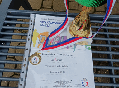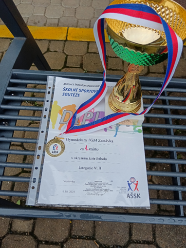 Ve čtvrtek 9. 10. 2025 se uskutečnilo na stadionu TJ Vranovice Okresní finále přeboru středních škol ve fotbalu chlapců, kterého se zúčastnily nejlepší týmy středních škol okresu Brno – venkov. Mezi 5 týmy nechyběli ani chlapci z naší školy – Gymnázia T. G. Masaryka Zastávka. Týmy hrály spravedlivým systémem každý s každým, takže 4 zápasy ukázaly naše kvality. První zápas jsme se trochu pomaleji „rozjížděli“ a s Gymnáziem Židlochovice jsme i přes více šancí vyhráli pouze 1:0. Postupně se naši borci ale zlepšovali a excelovali s Gymnáziem Ivančice, kdy zvítězili 7:0 po výborném výkonu všech hráčů. V dalším utkání se SOŠ Sokolnice, kdy se hrálo o celkové 1. místo, byl boj až do konce. Naše jednogólové vedení 1:0, 2:1 vždy soupeř dorovnal, ale na závěrečnou branku po nádherné akci Kotačky a Rambouska těsně před koncem již nedokázal odpovědět a vítězství tak bylo naše. V závěrečném utkání s SOU Kuřim si naši hráči pohlídali výsledek a po remíze 1:1 již mohli slavit postup do krajského finále. Po výborné hře v celém turnaji tak naši borci zvítězili a získali krásný pohár za 1. místo a postup do krajského finále.